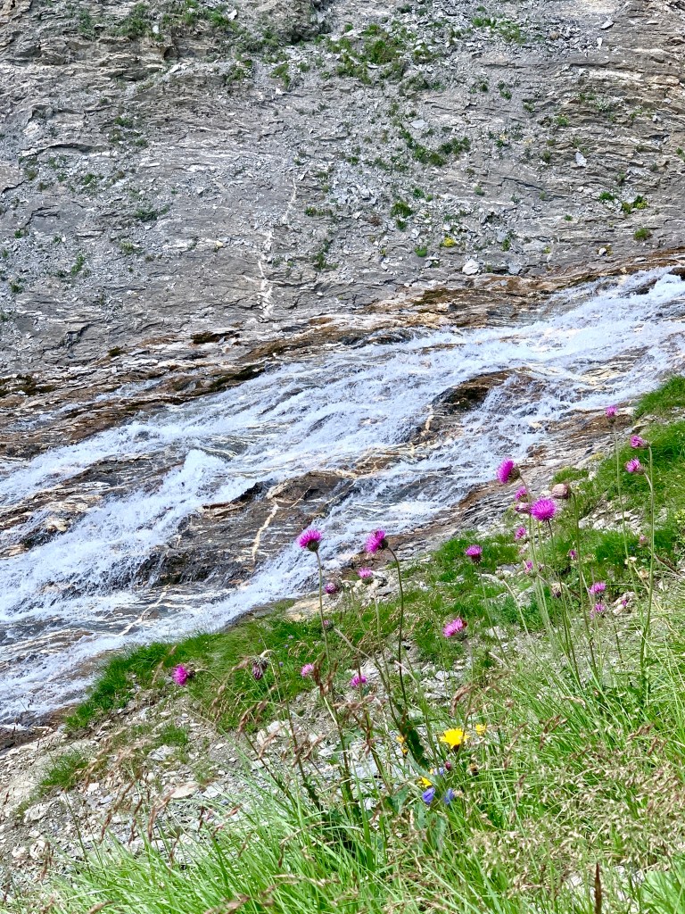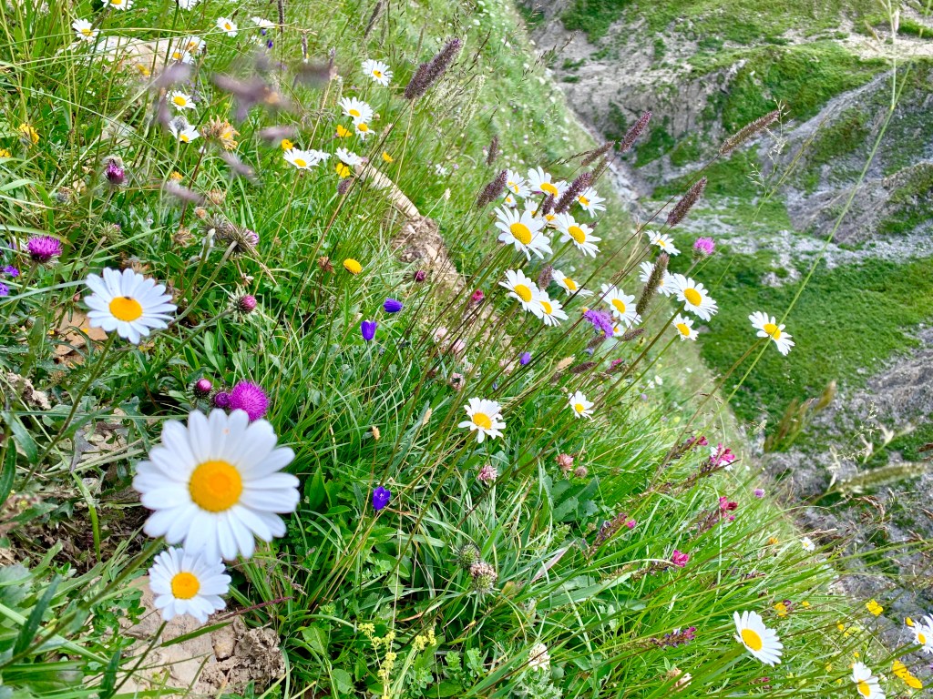 Zwischendurch stapfte ich auf einem vom Weidvieh völlig vermatscht-zerstampften Pfad und dann wieder durch vielfältigst blühende Bergblumenwiesen, und dann kam der ECHTE Murmeltiersteig! Es war eine wilde Lust wie die Murmel über die Hänge zischten, sich laut gellende Pfiffe zuwarfen und teilweise über ihre eigenen Leute purzelten. Ein echtes Schauspiel!