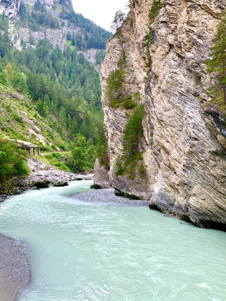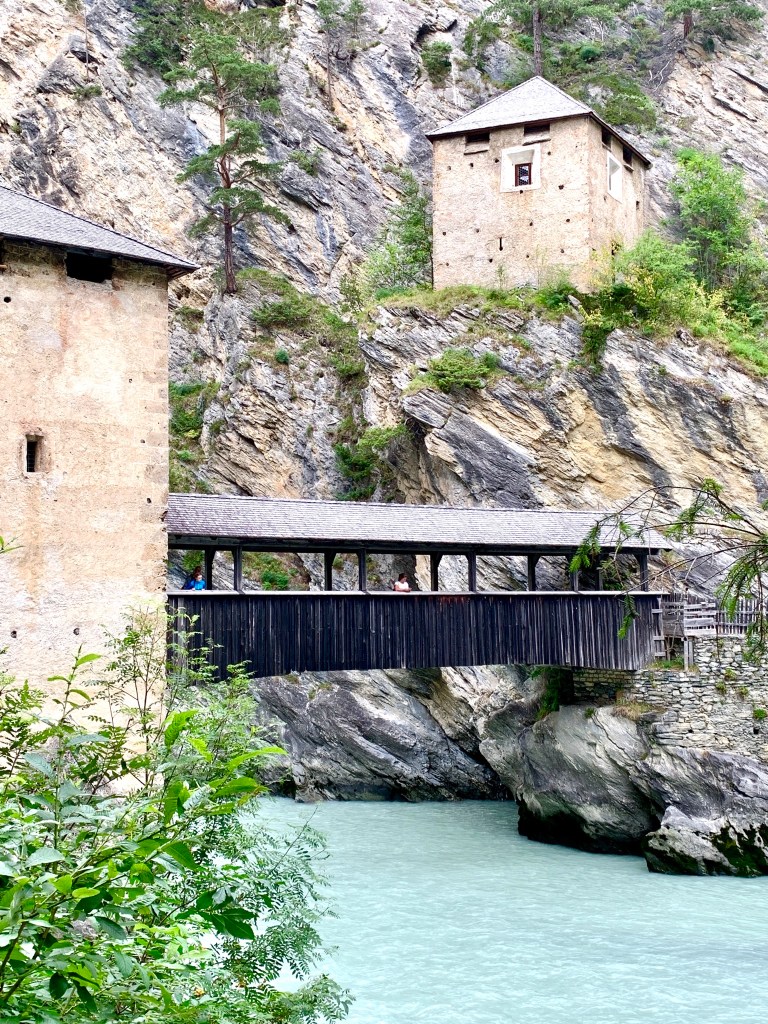 Der Weg führte unten am Fluss entlang, während sich die Reschenpassstraße in luftige Höhen aufschwang und über uns durch Felstunnels und Galerien führte. Mit dem rechten Fuß quasi auf der schweizer und dem linken auf der österreichischen Seite der Grenze erreichte ich Alt-Finstermünz, eine mittelalterliche Gerichtsstätte und Grenzbefestigung am bzw. über dem Inn.
