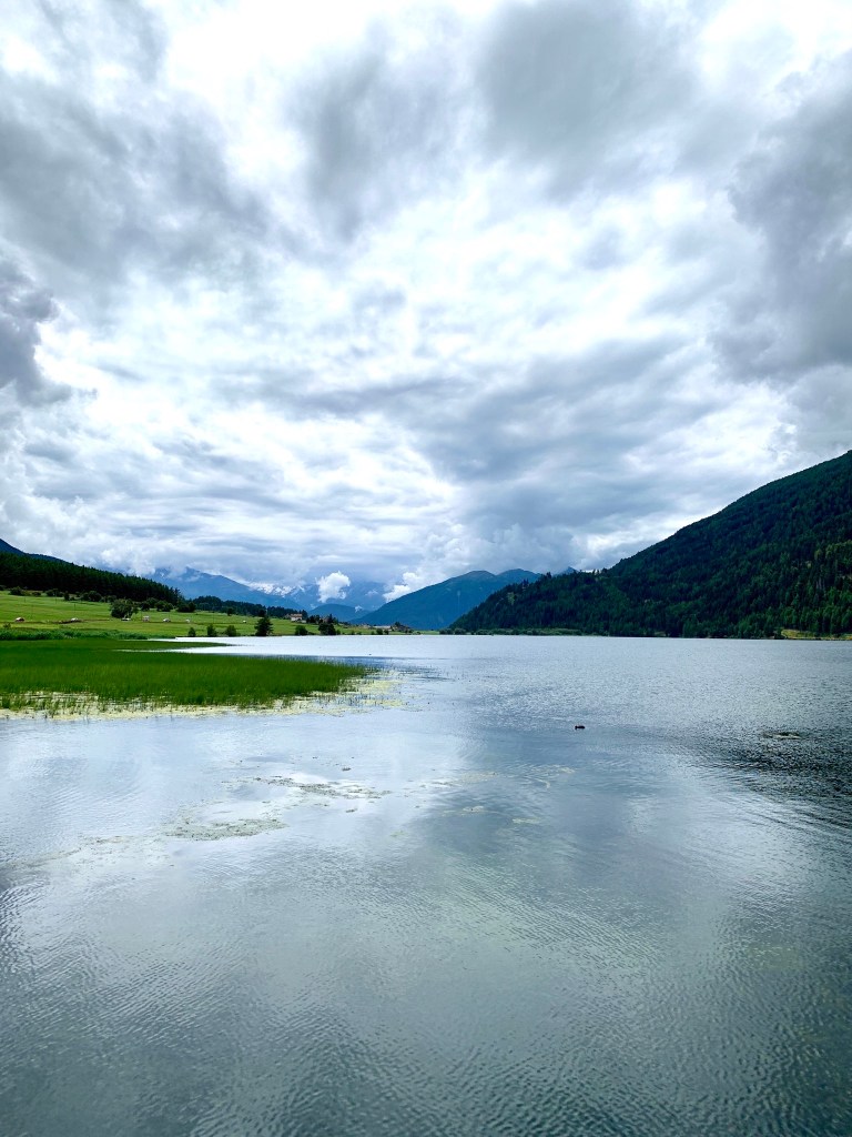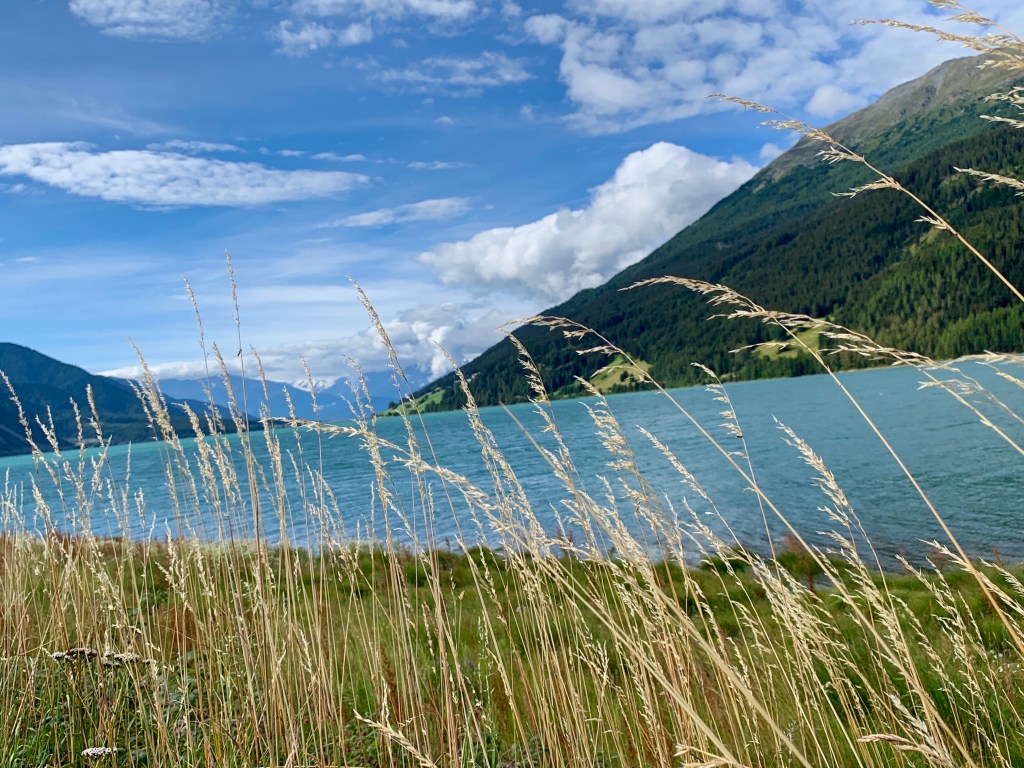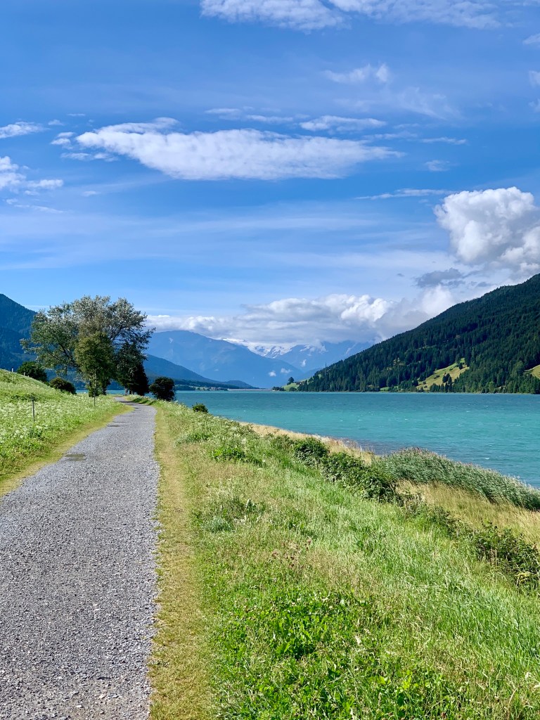 Gestern war‘s ein langer Hatsch (bayrisch für einen langen, eher langweilig-mühsamen Fußmarsch) von Reschen bis Mals im Oberen Vinschgau. Ich bin hauptsächlich dem Fahrradweg gefolgt, was der kürzeste Weg war (20 Kilometer und ein echt entspanntes Höhenprofil), aber das Wandern auf den asphaltierten Wegchen hat mich so platt gemacht, dass es abends zu nicht mehr viel kam, nicht zum Abendessen und nicht zum Blog schreiben. Hier also der Nachtrag!