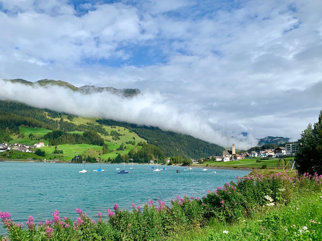 In der Nacht hatte es fürchterlich geschüttet und auch für den Tag zeigten die Wetter-Apps übereinstimmend Dauerregen. Irgendwie mochte das nicht so recht zum realen Bild passen, das sich mir morgens bot, als ich am Reschensee entlangspazierte. Es war herbstlich kühl, das ja, aber erstaunlich heiter-aufgeräumt.