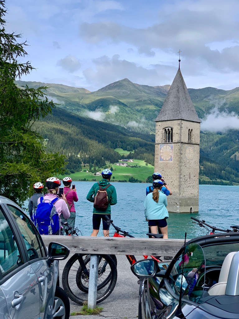 Das erste touristische Highlight war der alte Grauner Kirchturm, von dem nur noch die Turmspitze aus dem Wasser ragt. Der Rest wurde in den 50er Jahren von den noch präsenten Faschisten im Rahmen der See-Aufstauung samt dem Dorf Graun und diverser hundert Hektar Grund und Boden mir-nix-dir-nix versenkt. Immerhin hatte man den Dorfbewohnern vorher Bescheid gesagt und sie notdürftig in Barackenlagern untergebracht. Wie nett! Tragische Geschichten verjähren offenbar irgendwann und so gilt der Turm heutzutage als Wahrzeichen des Vinschgau und ist Publikumsmagnet für Touristen jedweder Couleur.