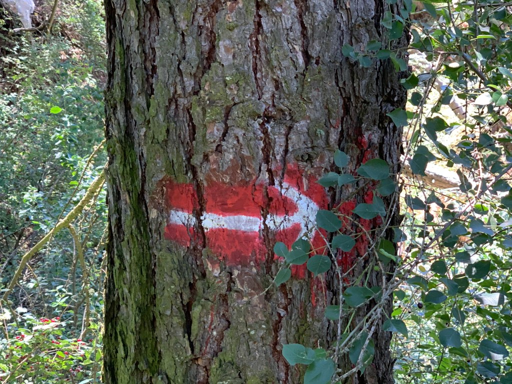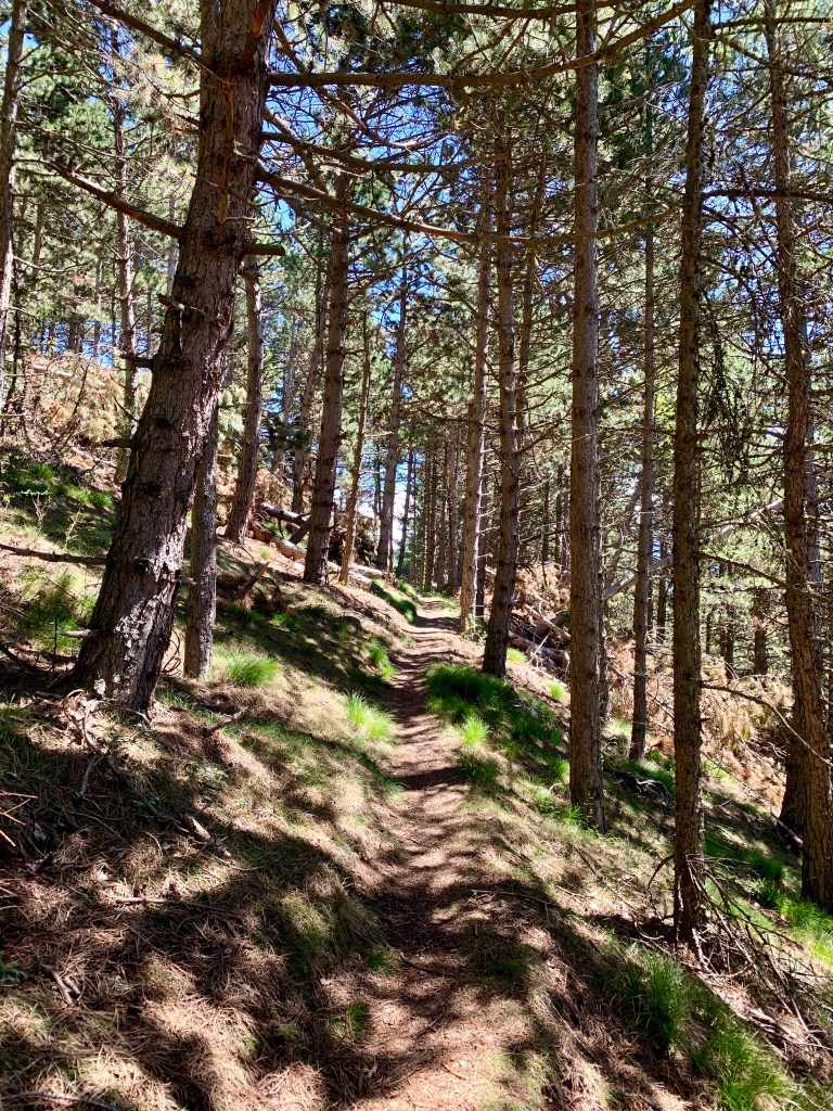 Dieser kleine Ausflug hatte uns ganz schön Zeit gekostet. Mittlerweile war es sommer-südlich heiß, und da kam uns der dann leicht-flockig dahinmäandernde Weg durch schattige Kiefernwälder gerade recht.
