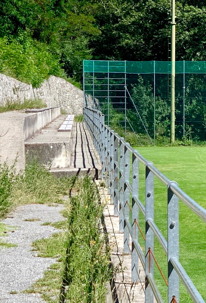 Danach marschierte ich tapfer weiter. In Tälern herrscht gemeinhin Platzmangel und das umso mehr, wenn auf jedem verfügbaren Zentimeter Apfelbäume gepflanzt werden. Da führt so ein Wanderweg schon mal über die Zuschauerränge des örtlichen Fußballfeldes (ernsthaft, da ging der Weg lang!).