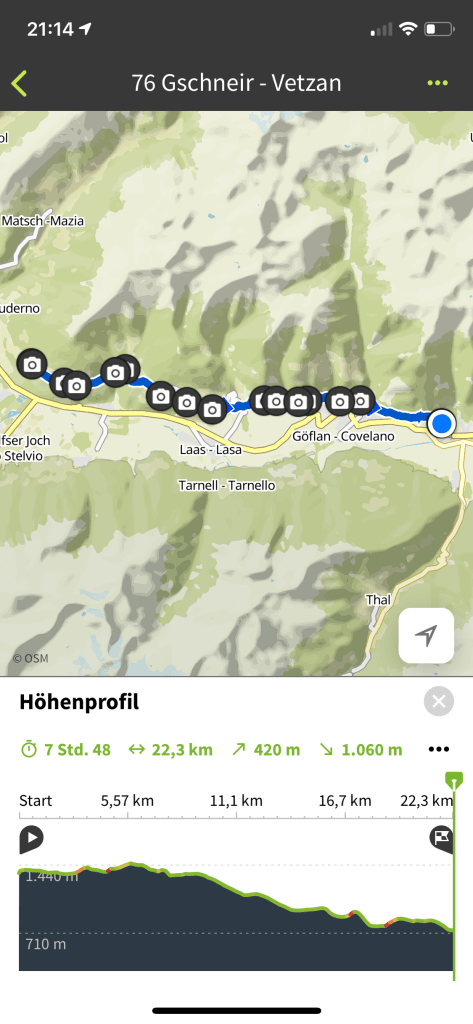 Gutgelaunt und mit besten Wegempfehlungen meines Gastgebers vom Mairhof brach ich kurze Zeit später auf Richtung Vetzan: 22 Kilometer, tendenziell den Berg runter.
