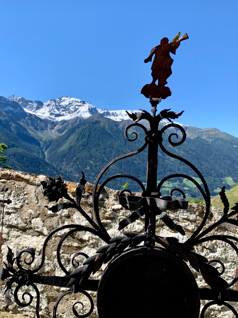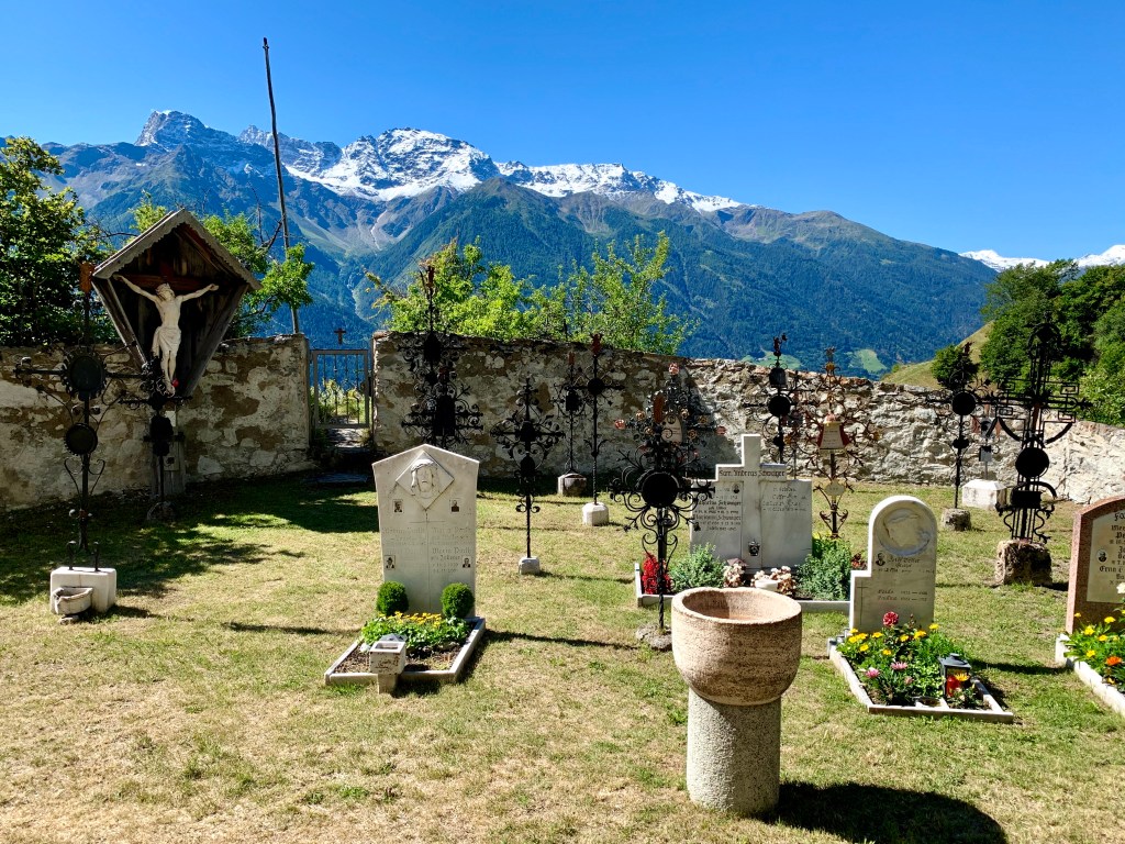 Bei der hübschen Kapelle St. Peter machte ich eine erste Pause und setzte mich aufs Bänkchen mit Blick auf den kleinen Friedhof und ins Tal. Was für ein Frieden! Manche Toten liegen eindeutig netter als andere, das ist mal klar. Weiß nicht, was man tun muss, um hier begraben zu werden – wahrscheinlich mindestens Alois oder Seppl heißen.