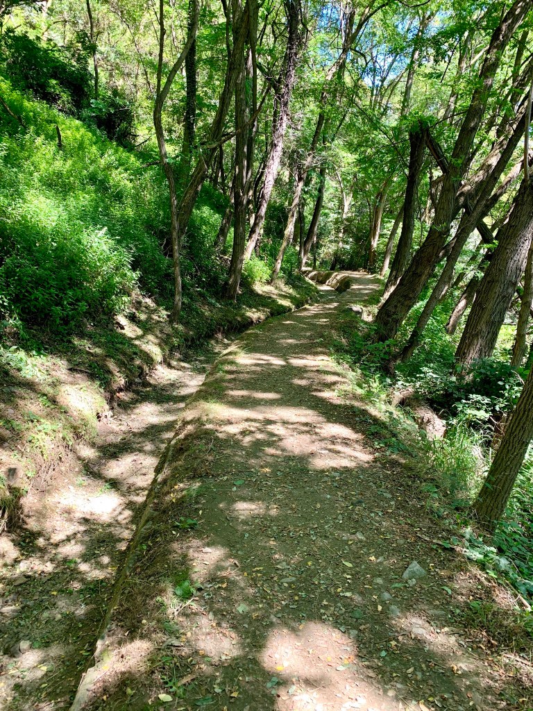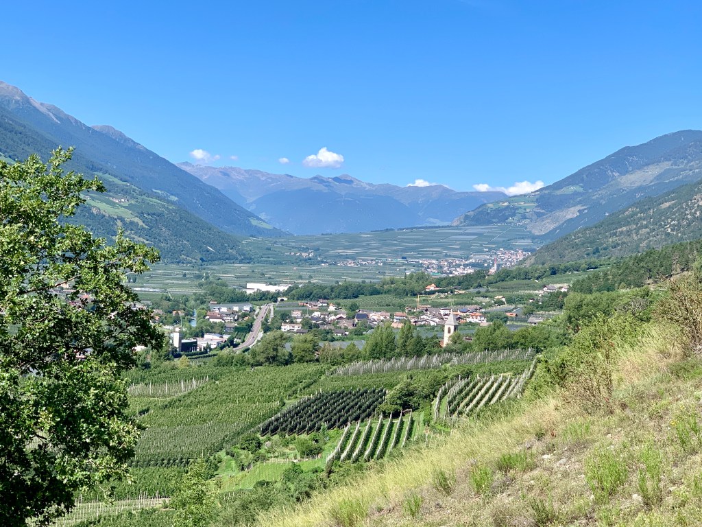 Also packte ich gestern Morgen meine Siebensachen und marschierte in die Richtung, wo ich einen Kaffee vermutete, ins Dorf Goldrain (Schöner kann ein Dorf nicht heißen, oder?). Dort saß ich dann beim Italiener (haha!) an der Dorfstraße, trank äußerst leckeren Cappuccino und aß Nusshörnchen von der Bäckerei gegenüber. Schweinehund lungerte zu meinen Füßen im Schatten. Er hatte so Ü-BER-HAUPT keine Lust, sich auf eine lange, wiederum sonnenheiße Etappe zu begeben. Doch Frau Komoot lockte mit schattigen Waalwegen auf halber Höhe und so machten wir uns gegen 10 Uhr dann doch mal auf den Weg.