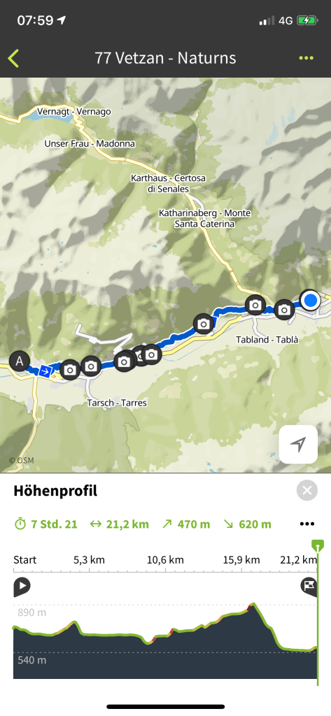 Es waren 21 Kilometer nach Naturns, wo ich heute einen Ruhe-Vorabschieds-Tag zelebriere. Heute Abend wird Meister Eckart mit Schweinehunds Kumpel (aus dem Lechquellgebirge) nochmals zu uns stoßen, und wir werden noch gemeinsam zwei Etappen Meraner Höhenweg gehen – bis Meran (oder so) und dort wird mein Weg erst einmal zu Ende sein.