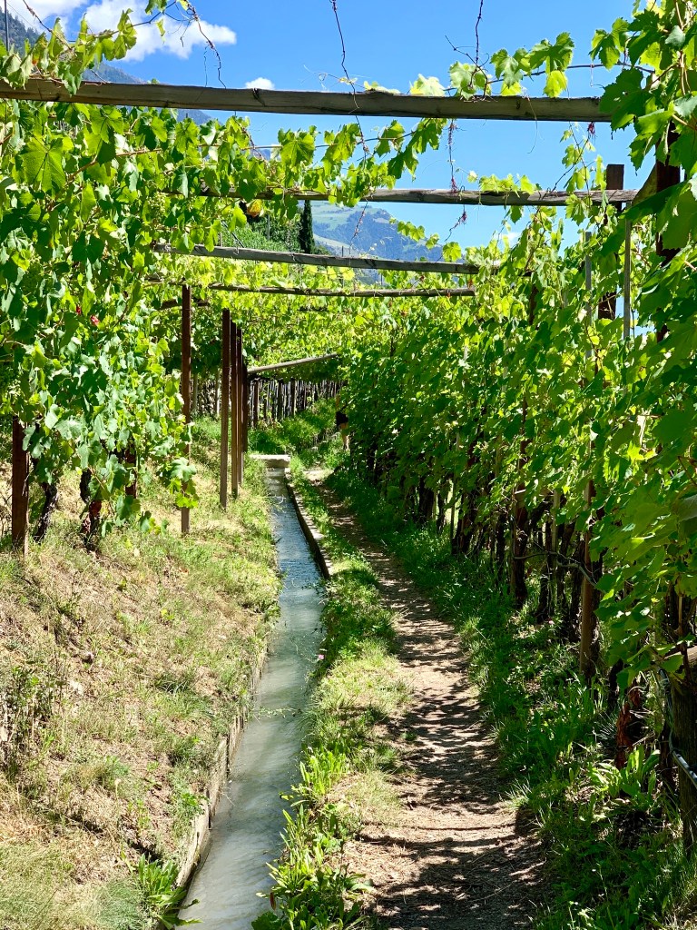 Waale, so lerne ich, werden „gefasst“, also das Wasser aus den Bergen kommend zusammengefasst und fortan als „Wasserwosser“ (Wasser zum Wässern) künstlich im Waal gelenkt und zu den zu bewässernden Feldern geleitet. Inwiefern die Waale (sie entstanden Ende des 19. Jahrhunderts) auch heute noch zum Wässern genutzt werden oder aber nurmehr touristische Attraktion sind, konnte ich auf die Schnelle nicht abschließend recherchieren.