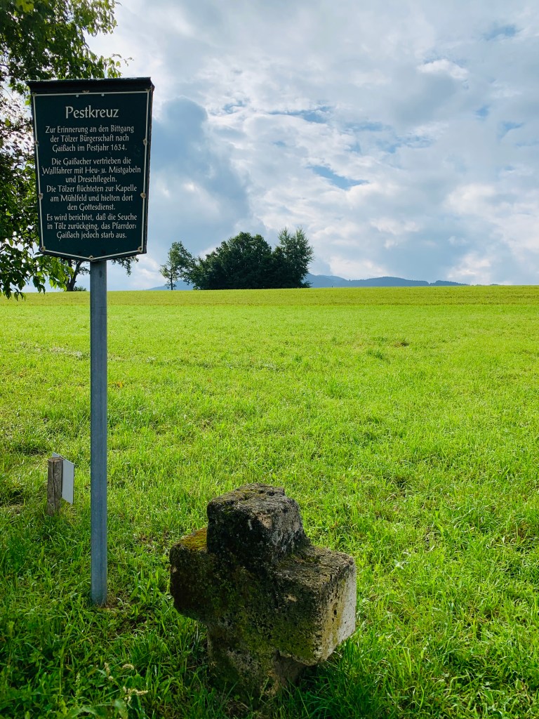 Wenig später das (etwas mickrige) Pestkreuz, das an einen Bittgang der Tölzer im Pestjahr 1634 erinnert. Das Dorf Geißach starb kurz darauf aus, vermutlich weil die Geißacher die Wallfahrer mit Dreschflegeln und Mistgabeln vertrieben hatten. Was lernen wir daraus? Besser keine Pandemie-Wallfahrer mit Mistgabeln vertreiben – das könnte böse Folgen haben.