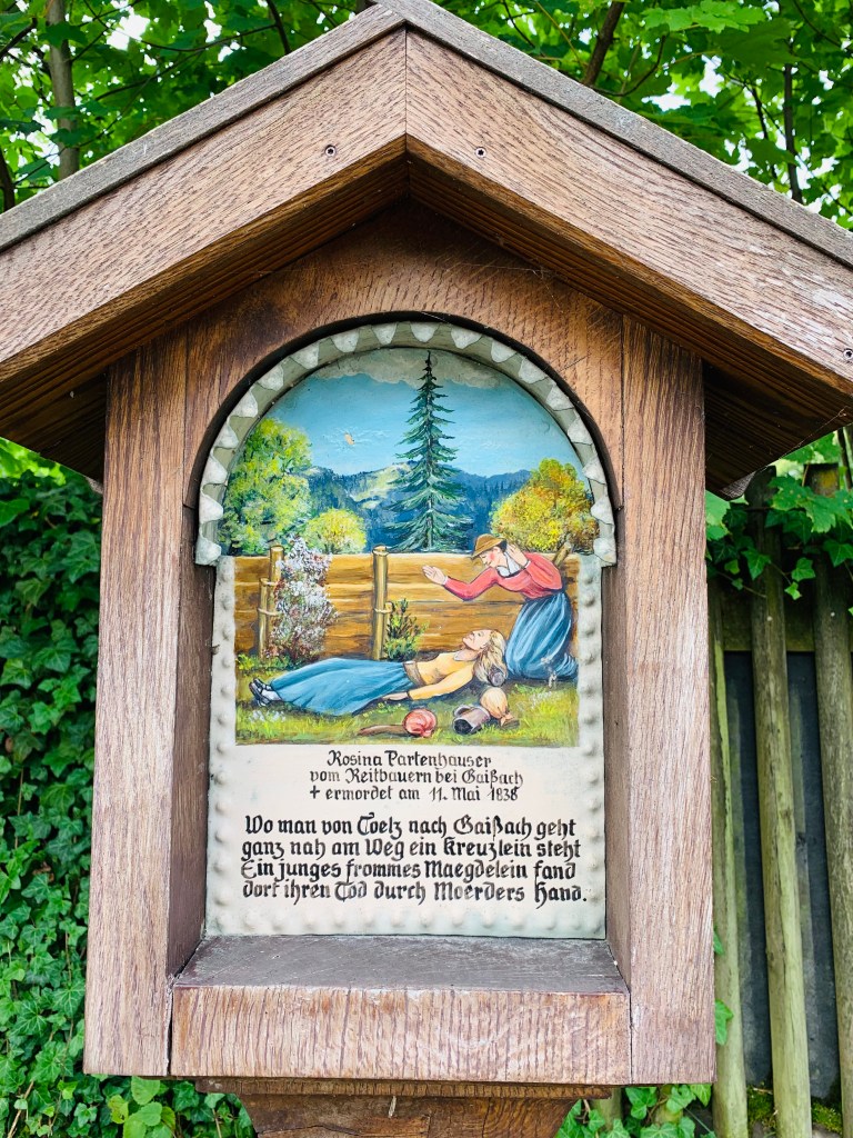 Am Ortsrand von Bad Tölz begegnete ich dem ersten von mehreren Wegkreuzen, mit denen hierzulande offensichtlich am Wegesrand Verstorbener gedacht wird. Das Mägdelein Rosina Partenhauser vom Reitbauern bei Geißach, ach, wurde hier doch tatsächlich im Jahre des Herrn 1838 heimtückisch ermordet. Nicht schön.