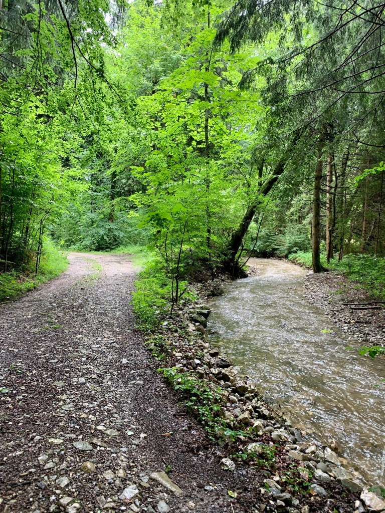 Tag drei (Mittwoch, 28.07.2021) auf dem Weg nach Berchtesgaden begann mit einem coronakonformen Frühstück in Gesellschaft der Hamburger Herren und einer recht unerfreulichen Wetterprognose – Regen (drei Tropfen!) ab Mittag. Also nix wie los – Tschüssle (!), ihr Beiden, habt einen guten Weg! – und schwupps war ich auf der Strecke Richtung Finsterwald (huuuhh!) am Tegernsee, Schweinehund- und Blasen-freundliche 16 Kilometer – wie schön.
