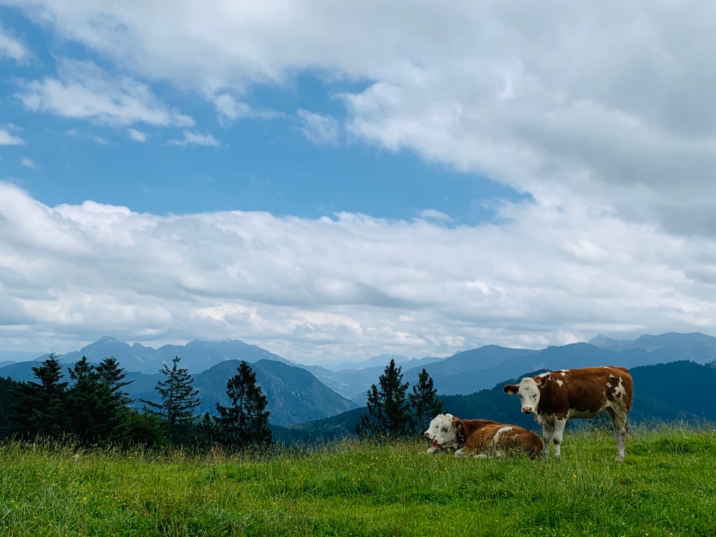 Für die Gindlalmen plante ich meinen Absprung; ich würde wohl Pause machen wollen. „Bist du wahnsinnig?“, blaffte Frau Komoot mich an. Und auch sie hatte Recht. Fredl nämlich traf sich dort mit einem Freund, der uns denn auch kurz darauf an der Kuhpforte in Empfang nahm. Kein Entrinnen! Kumpel Bernd nötigte uns zu einem Hirschkuss – a Schnappserl geht immer – (Anlass für eine weitere Fredl-Anzüglichkeit) und entpuppte sich dann als deutlich wohlerzogener und eloquenter. Der Prof. Dr. med. Dr. med. habil. Bernd S., seines Zeichens Gefäßchirurg und Buchautor, mit Villa am Tegernsee und großem Ego, SEHR großem Ego, wusste sich einigermaßen gepflegt zu unterhalten. Nach einer Pflicht-Saftschorle machte ich dennoch, dass ich fortkam.