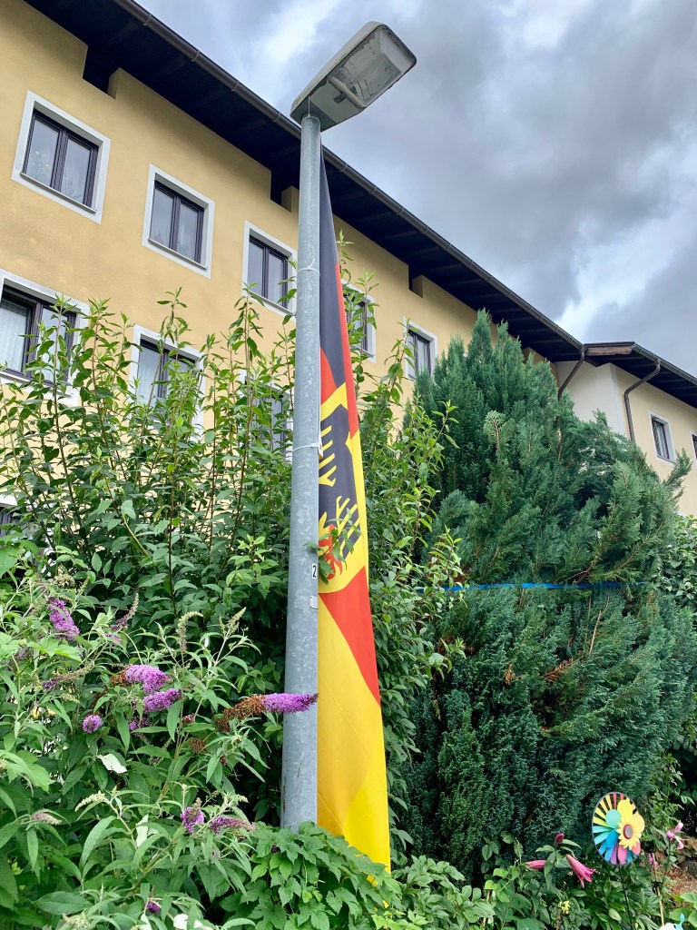 Im mutmaßlich romantischen Örtchen „Winkl“ wollte ich ein regen- und mückenfreies Päuschen in einem hübsch-winkligen Cafe einlegen. Leider landete ich stattdessen im „Huchting“ (Bremer Brennpunkt) von Berchtesgaden, sprich in einem Ortsteil, geprägt von Sozialbau-Klötzen. Nix mit oberbayrischer Romantik! Aber auch dort sind „wir“ gut deutsch und hissen unsere Flagge schon mal am Laternenmast.