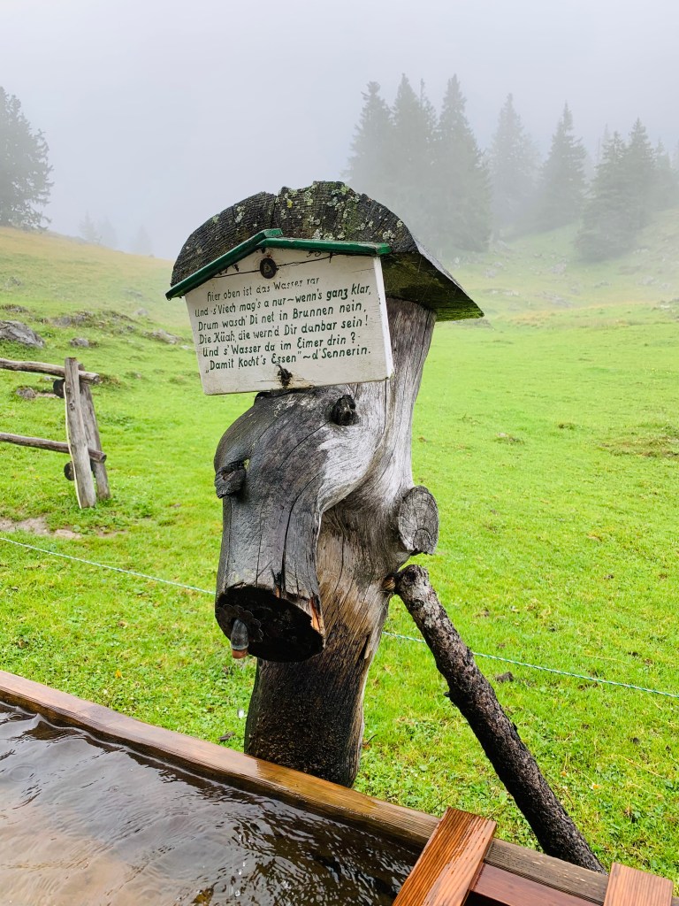 Da mehrere Almen am Weg lagen, hatte ich weder Essen noch übermäßig Wasser dabei. Ungünstig, wenn dann das Wetter schlecht, der Tag fortgeschritten und die Almen infolgedessen geschlossen sind. So traf ich direkt nach dem Aufstieg zur Kohleralm am Almengatter den Senner mit Rosi Mittermaier im Schlepptau. Vielleicht war‘s auch nur ne Erscheinung, die mir jedoch den Weg zum Trinkwasserbrunnen wies. Wohin ich denn noch so spät wolle, bei dem Wetter, ah Reichenhall, da gehst über die Zwieselalm, jo, is scho no weit und auf und ab und viele Wurzeln drin. Und so war’s dann auch.