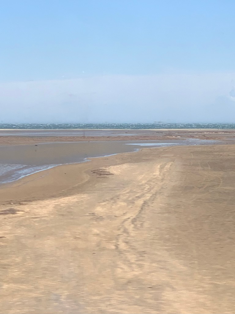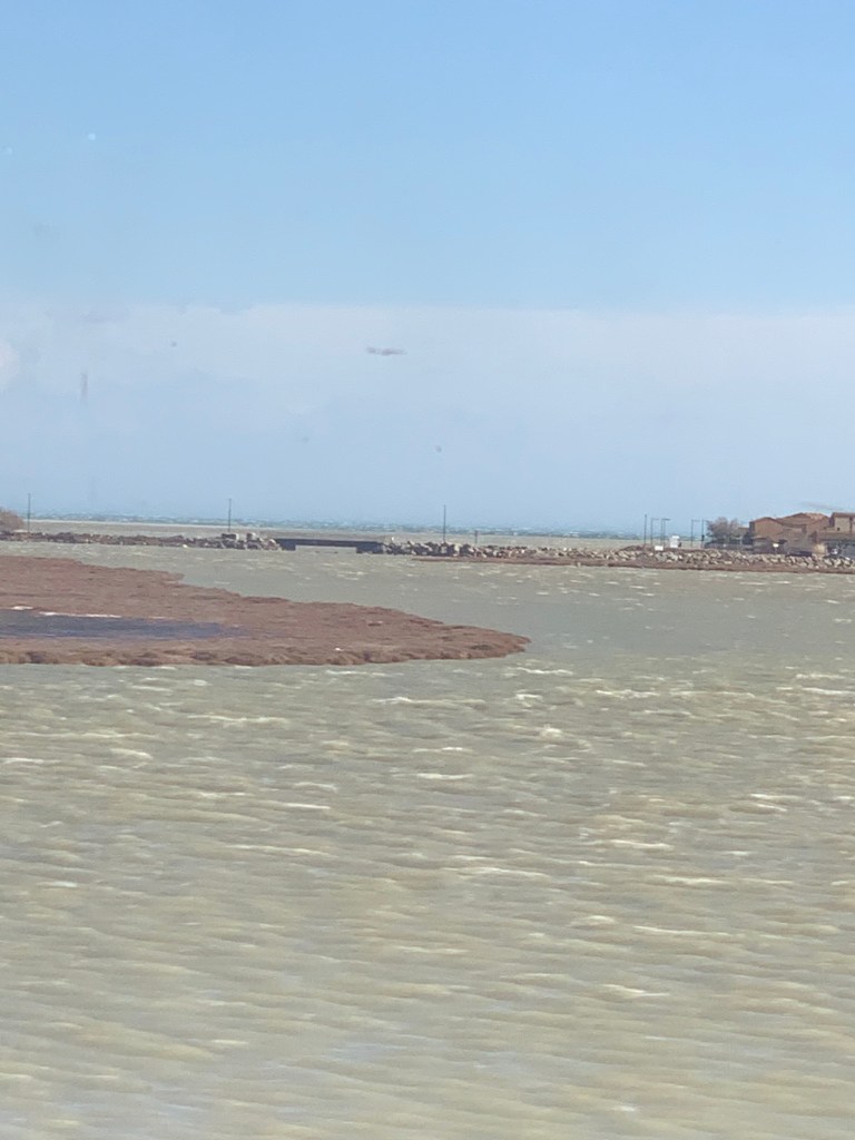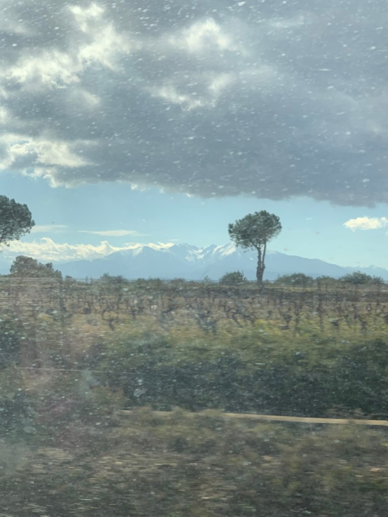 Ab Narbonne fuhr der Zug küstennah durchs Marschland und ein bissiges Misträlchen (ihr wisst schon, der „katabatische, also kalte, trockene, oft starke Fallwind“ – Wikipedia) wirbelte draußen die Küstenwelt samt Gischt und Flamingos durcheinander – und rüttelte außerdem ganz ordentlich an unserem Züglein. Die Fotos musste ich leider aus der zweiten Reihe durch völlig verdreckte Zugfenster schießen.