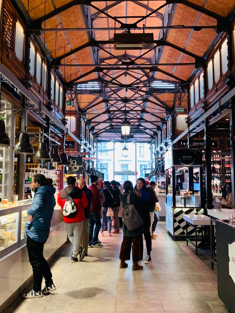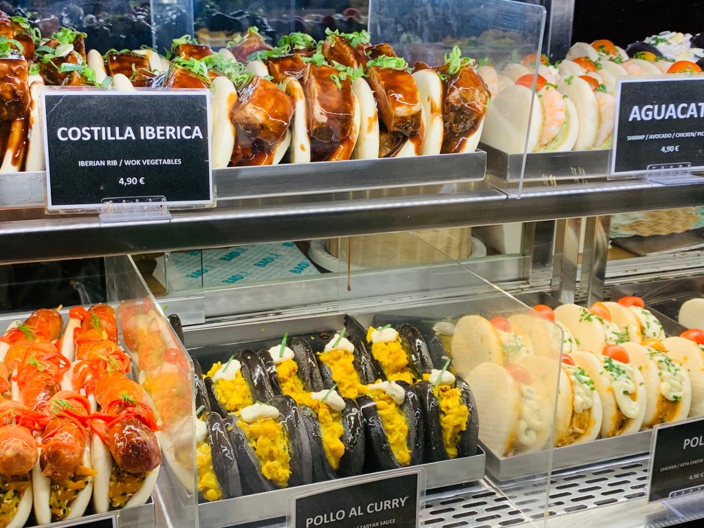 Gegen Mittag schlenderten wir Richtung Bahnhof. Dabei stolperten wir erst über demonstrierendes Madrilenen-Volk (für eine angemessene medizinische Grundversorgung, wenn ich das mit meinen bescheidenen Spanisch-Kenntnissen richtig übersetzt habe) und dann über eine der historischen Markthallen. Schweinehund machte großgroße Hundeaugen und schleckte sich schon mal sein Maul. Und da das Frühstück ausgefallen war und die Pinchos und Tapas aber auch gar zu lecker aussahen, schmiss ich eine Runde dieser spanischen Häppchen. Hmmmm..!