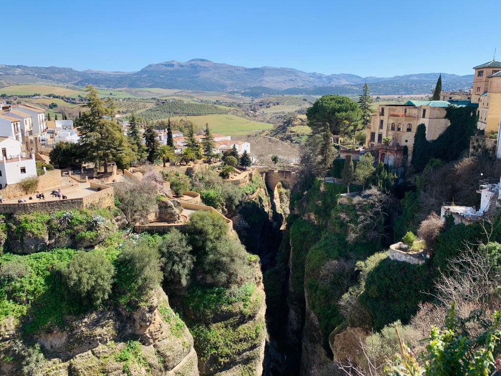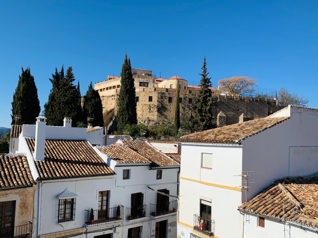 Bis Cordoba flutschte es wie gewohnt Hochgeschwindigkeitszug-mäßig, aber dann blieben wir irgendwo im andalusischen Hinterland hängen und standen dort erst einmal. Danach ging es im Bimmelbahn-Tempo weiter durchs Hügelland, vorbei an Olivenhainen und Weinbergen, der untergehenden Sonne entgegen … bis wir schließlich Ronda erreichten. Schon Ernest Hemmingway empfahl: „Besuchen Sie Ronda, wenn Sie wieder mal nach Spanien kommen sollten (ja, mach ich doch schon). Für eine Hochzeitsreise (diesmal nicht) oder mit einer Freundin (ach, das wär schön). Die ganze Stadt und ihre Umgebung gleichen einem romantischen Bühnenbild.“ Und genauso ist es auch – wie ich heute feststellen durfte.
