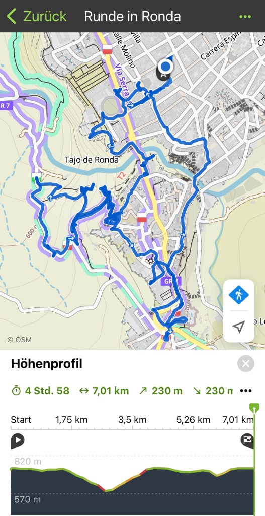 Die Stadt liegt auf großen Felsblöcken hoch über dem El Tajo und unbestrittenes Highlight ist wohl die Brücke, die die beiden Stadtteile miteinander verbindet. Naturgemäß lässt sich ein solches Motiv am besten von unten fotografieren, doch während die meisten Mit-Touristen es nur bis zum ersten Absatz in die Tiefe schafften, verordnete uns Frau Komoot Höhenmeter-Training (Sie: „Ihr werdet mir noch dankbar sein.“ – „… dankbar sein“, äffte Schweinehund augenrollend) – und so stiegen wir einmal ganz ins Tal und dann wieder hinauf in die Altstadt.