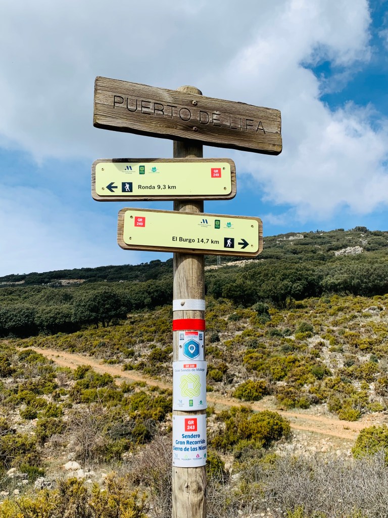 Aus der Stadt hinaus zog es sich gleich mal – vorbei an modern-andalusischen Reihenhaussiedlungen und diversem infrastrukturell notwenigem Gedöns – und schnell wurde klar: Was auch immer die Postmeisterin gestern eingepackt und weggeschickt hat; es erleichtert unseren Rucksack gefühlt nur unwesentlich. Kurz hinter dem letzten Einkaufszentrum trafen wir doch tatsächlich (die Spanier haben es ja nicht so mit dem Wandern…) auf ein Schild, das die bevorstehende Wanderung illustrierte. Geplant ist der rot-weiß-gepunktete Weg bis Ojén. Heute Abend fühle ich mich ehrlich gesagt nicht danach…