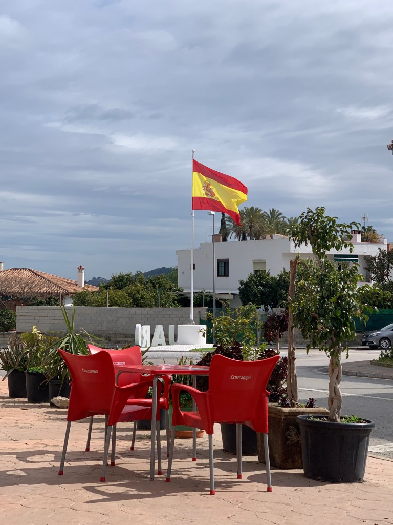 Die Minuten verstrichen – die spanische Flagge flatterte am Kreisverkehr im Wind, der Postbote kam vorbei und dann ein Baby-Bagger. Dann passierte wieder nix. Und gerade als ich meinte, herausgefunden zu haben, dass DER Bus gar nicht an MEINER Haltestelle vorbeikommen würde, bog er dann doch um die Ecke. Der freundliche Busfahrer gestaute mein Gepäck, um mir dann mit Verweis auf ein entsprechendes Schild mitzuteilen, dass er meinen 20-Euro-Schein nicht annehmen dürfe (digitales Bezahlen natürlich auch Fehlanzeige), ich könne ja aber in die Bar gehen und dort wechseln lassen. Gesagt, getan – und der Bus wartete auf mich (da wundert dann die Verspätung auch nicht).