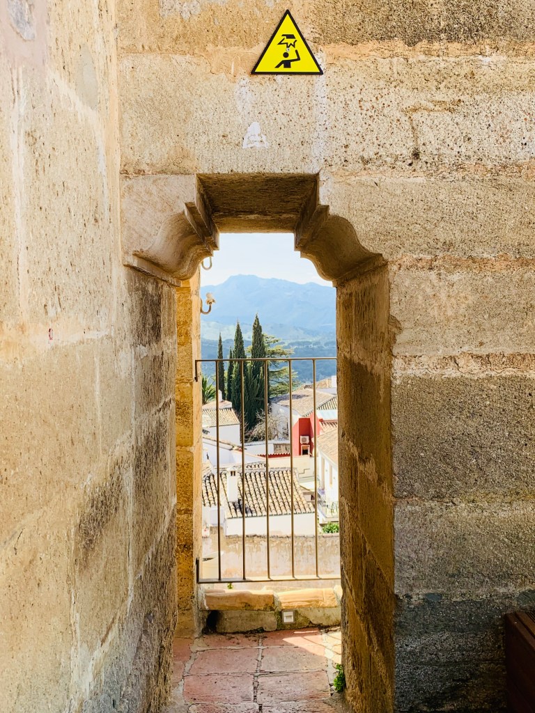 Aufgrund meines zweitägigen „Vorbereitungs-Camps“ konnte ich die Reisegesellschaft in Ronda zielsicher erst zu einem zentrumsnahen Parkplatz, dann in eine leckerschmecker Tapas-Bude und hernach zu den visuellen Highlights des Ortes geleiten. Zum Abschluss gab‘s dann auch noch was Neues für mich: Die Turmbesteigung der Iglesia de Santa Maria la Mayor mit einem hübschen Blick zurück in die Berge – und natürlich passte die Reiseleitung auch auf, dass sich niemand das Köpfchen stieß.