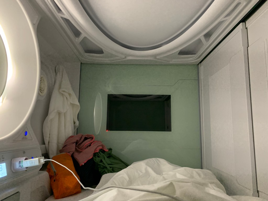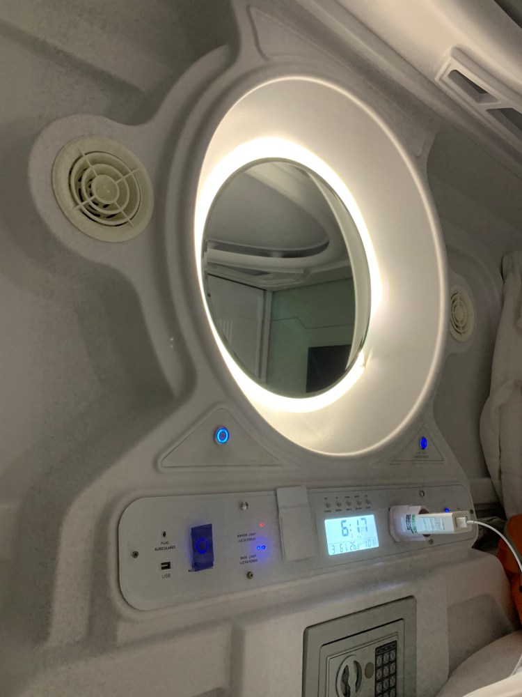 ‚Rooms‘ ist irreführend, denn es sind keine Räume, Zimmer schon gar nicht, und wenn man sich die booking-Bewertungen so anschaut, gab‘s da auch schon böse Überraschungen. Es sind bessere Kojen, die entlang eines Gangs rechts und links und in zwei Ebenen angeordnet sind. Alle haben die Größe einer Matratze und sind mittels einer Schiebetür verschließbar. Folgendes Foto zeigt meine Kapsel – ich liege auf der Matratze und fotografiere Richtung Fußende.