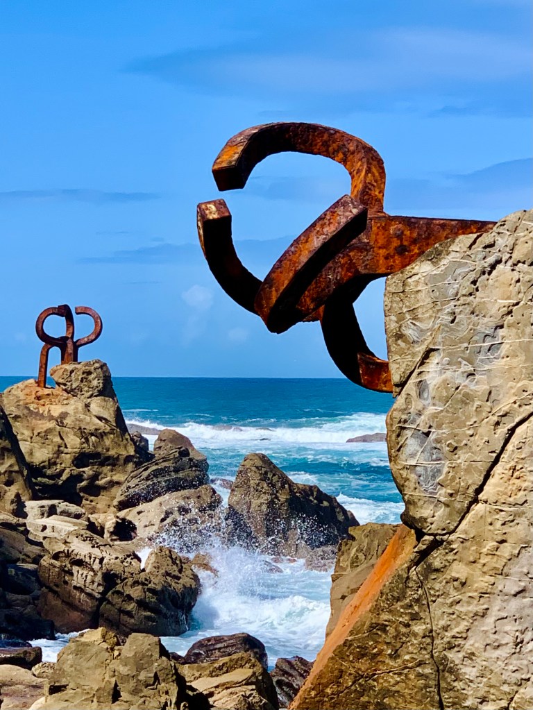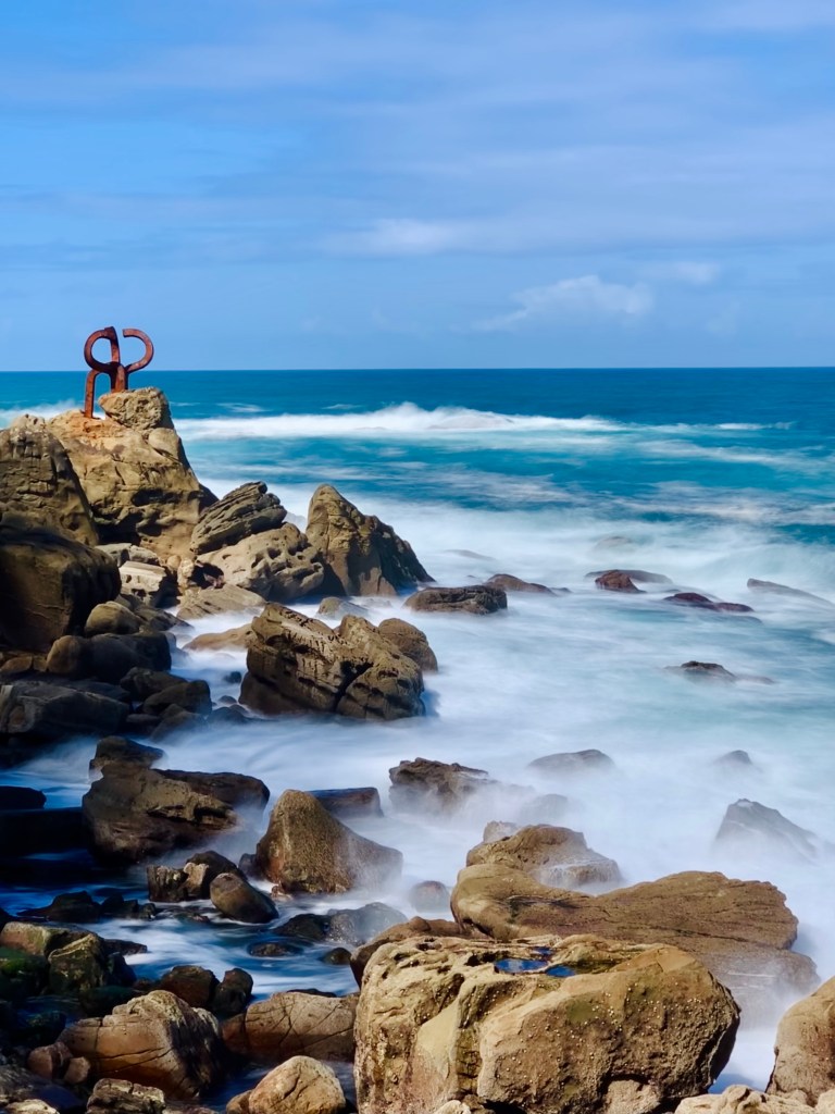 Es gab an diesem Tag nicht viel zu kämmen – der biskayische Wind hatte sich gelegt und es war sonnig warm. Und als auch die Horden französischer Schulklassen sich verzogen hatten, konnte ich dieses wunderbare Kunstwerk so richtig genießen. Toll, dieses Zusammenspiel aus herrlich verrostetem Stahl, Felsen und Meereswellen.