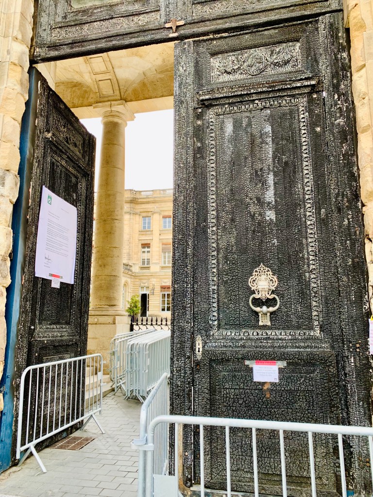 Als ich das nahe gelegene Rathaus näher besah, fiel mir die etwas merkwürdige Farbe und Struktur des Portals auf. Erst dachte ich, der Zahn der Zeit oder die salzhaltige Meerluft (dabei sind es bis zum Meer 65 Kilometer) hätten daran genagt, dann sah ich, dass die Tür verkohlt war. Flugs gegoogelt erfuhr ich, dass es hier just letzten Donnerstag zu Krawallen und Ausschreitungen wegen der Rentenreformpläne von Monsieur Macron kam. In diesem Zuge wurde offenbar auch das Portal in Brand gesteckt. Oha! Da bin ich aber jetzt schon recht froh, dass ich Bordeaux friedlich erleben darf.