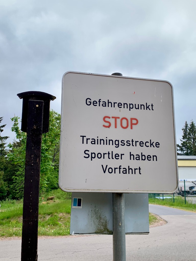 Schon einige Kilometer vor der Thüringer Hütte standen die Zeichen auf Biathlon. Da wurde man mitten im Wald freundlichst auf querende Sportler:innen und die zu wählende Laufrichtung hingewiesen.