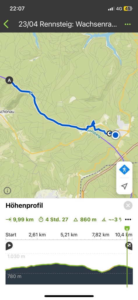 10 Kilometer bis Oberhof zu meinem Hotelzimmer samt Dusche, Bett, Steckdosen, warmen Gerichten und Supermärkten.