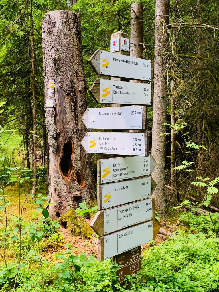 Kurz danach teilte sich der Goldsteig in Nord- und Südroute. Während die Südroute in gemäßigten Gefilden bleibt, schwingt sich die Nordroute zu den höchsten Gipfeln des Bayerischen Waldes auf. Und natürlich sind wir dabei, bei der Nordroute: noch 280 Kilometer bis Passau, dem offiziellen Endpunkt des Goldsteigs.