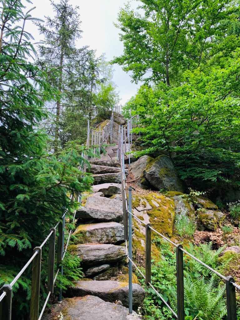Über einen Kilometer ging es auf einem schmalen Grad über Felsblöcke – alles typisch deutsch doppelt und dreifach gesichert, auf dass kein Wanderlein Schaden nehme. Vom höchsten Punkt gab es als Belohnung für die Mühen hübsche Ausblicke ins Regenschauer-Land.