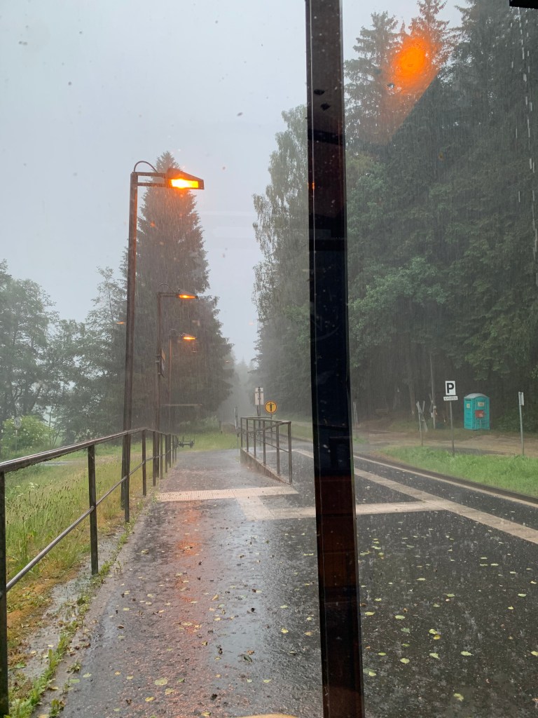Ich gab alles, um vor der Gewitterfront in der Pension Osserblick zu sein. Als ich an der Talsohle erst Bundesstraße und dann Bahnlinie überquerte, war eigentlich schon klar, dass ich es nicht schaffen würde. Dennoch nahm ich Anlauf und spurtete mit Karacho den Gegenanstieg Richtung Pension hoch – noch 1,6 Kilometer. Frau Komoot feuerte mich an, aber Schweinehund sah immer wieder besorgt Richtung Himmel. Blitze zuckten, Donner grollten. Nach 100 Metern im Wald wurde der Wind so stark, dass es Kiefernzapfen und Äste hagelte. Also machte ich auf der Stelle kehrt (schließlich wollte ich nicht am längsten Tag des Jahres den Gewittertod sterben) und suchte Zuflucht im Wartehäuschen der Bahnstation Watzlsteg, das da freundlicherweise verlassen in der Gegend rumsteht. Weiß nicht, ob hier jemals ein Zug kommt…