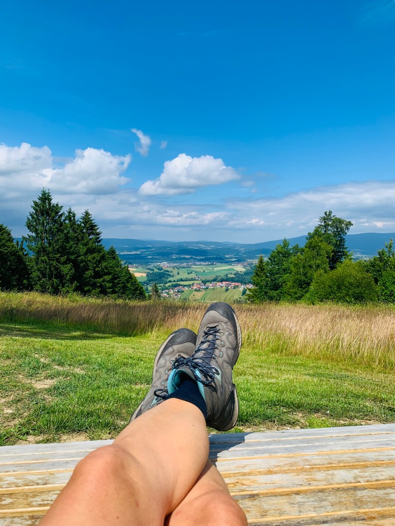 … und ein letztes hügeliges Aufbäumen des Bayerischen Waldes in Form des Oberfrauenwaldes (Berg) samt Himmelsliege und Aussicht.
