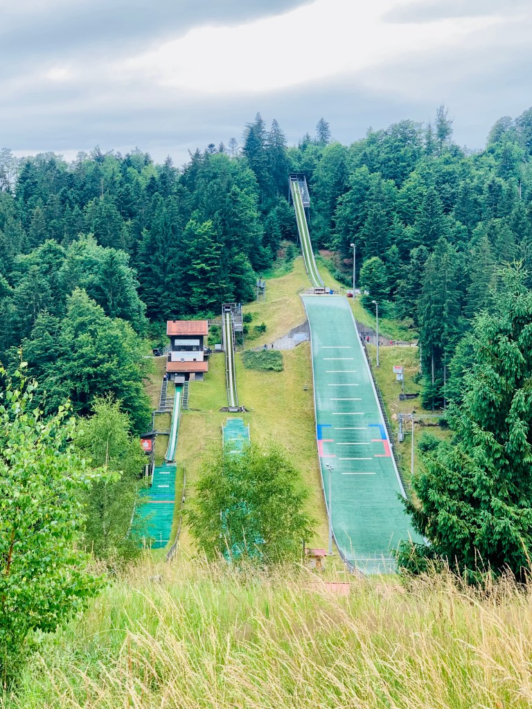 Auf den ersten Kilometern hatte ich nebenbei Diverses zu organisieren (Geburtstagsgeschenke etc.) und prompt kam ich einige Male vom Weg ab. Beim dritten Mal tadelte mich Frau Komoot kopfschüttelnd und brachte mich zurück auf den Weg und ins Hier und Jetzt. Und da tauchte denn auch prompt ein kleines Highlight am Wegesrand auf: Die Mattenschanze von Breitenberg. Schon bei der Quartiersuche hatte es geheißen: “Oh, schwierig, die Skispringer sind da.“ (damals dachte ich: „Aah ja…?“) und da war er dann auch, der deutsche Skisprung-Nachwuchs, der sich todesmutig ein ums andere Mal von der Mattenschanze stürzte.