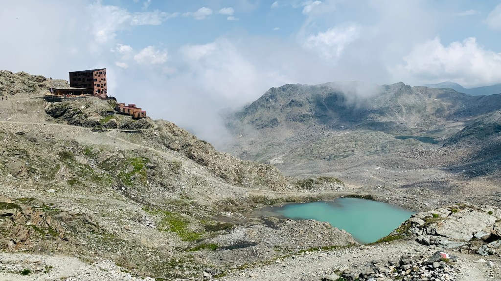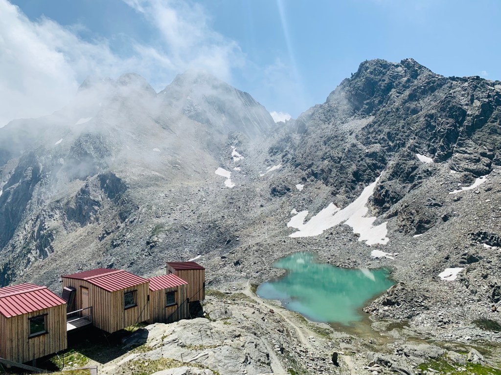 Nach vier Stunden war es dann endlich geschafft und wir standen auf der Terrasse der Stettiner Hütte. Der wie ich finde ziemlich spektakuläre Neubau wurde – nachdem die alte Hütte 2014 einer Lawine zum Opfer gefallen war – erst letztes Jahr eingeweiht.