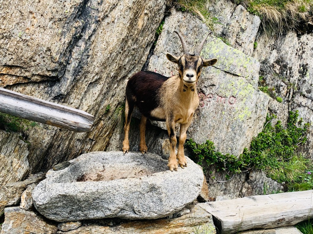 Während wir lockerflockig bergab trabten, quälte sich in der Gegenrichtung die Meraner-Höhenweg-Gemeinde den Berg hoch. Bei Almwiesen, Bächlein und Co. angekommen machte ich erst nochmals eine ausgedehnte Pause mit am Hotel-Buffet gemopstem Käsebrötchen, frischem Quellwasser und meinen geliebten Mannerschnitten, während Schweinehundchen vollkommen eins mit sich und der Welt seinen Spaß mit ein paar Bergziegen hatte.
