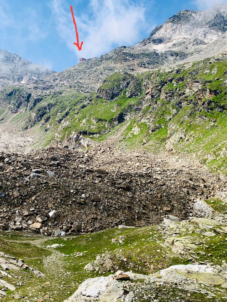 Da, wo auf dem zweiten Foto links die Wolken übers Jöchl wabern, ging es dann hoch: Stapfstapfstapf, einen Fuß vor den anderen, nicht anhalten, kräfteschonende kleine Schritte, einatmen, ausatmen … und irgendwann nach drei Stunden – die Wolkenwaberkante lag längst hinter uns – gab’s ein zusätzliches Motivationszuckerl in Form der Stettiner-Hütten-Sichtung; zwar noch in luftigen Höhen und deutlicher Entfernung, aber immerhin.